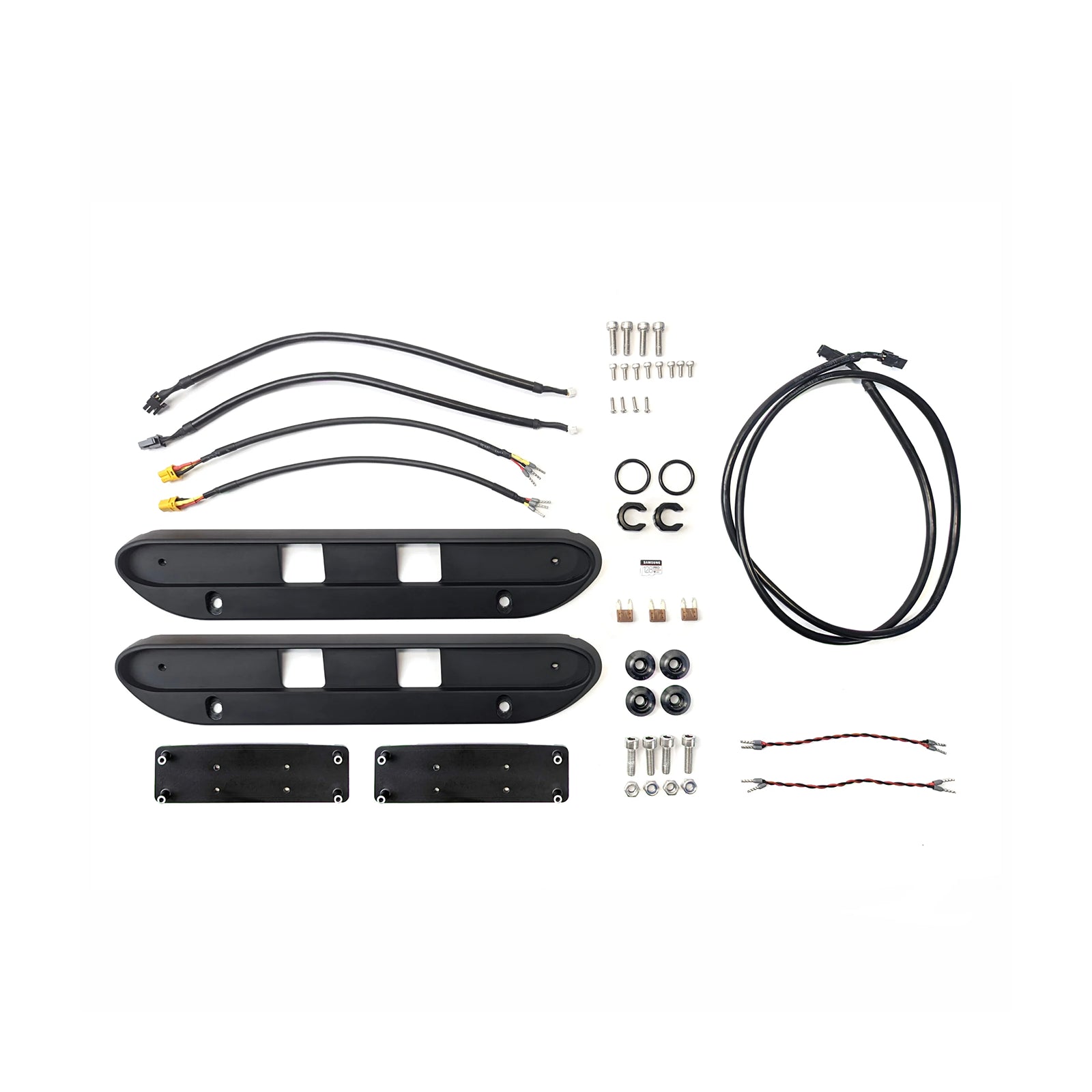 Included are two transducer mounts for the BlueBoat hull, two PCB mounts that fit the BlueBoat’s electronics tray, a few cables, and installation hardware. It also includes a 128 GB microSD card flashed with BlueOS, which gives you enough space to log large sonar data files.